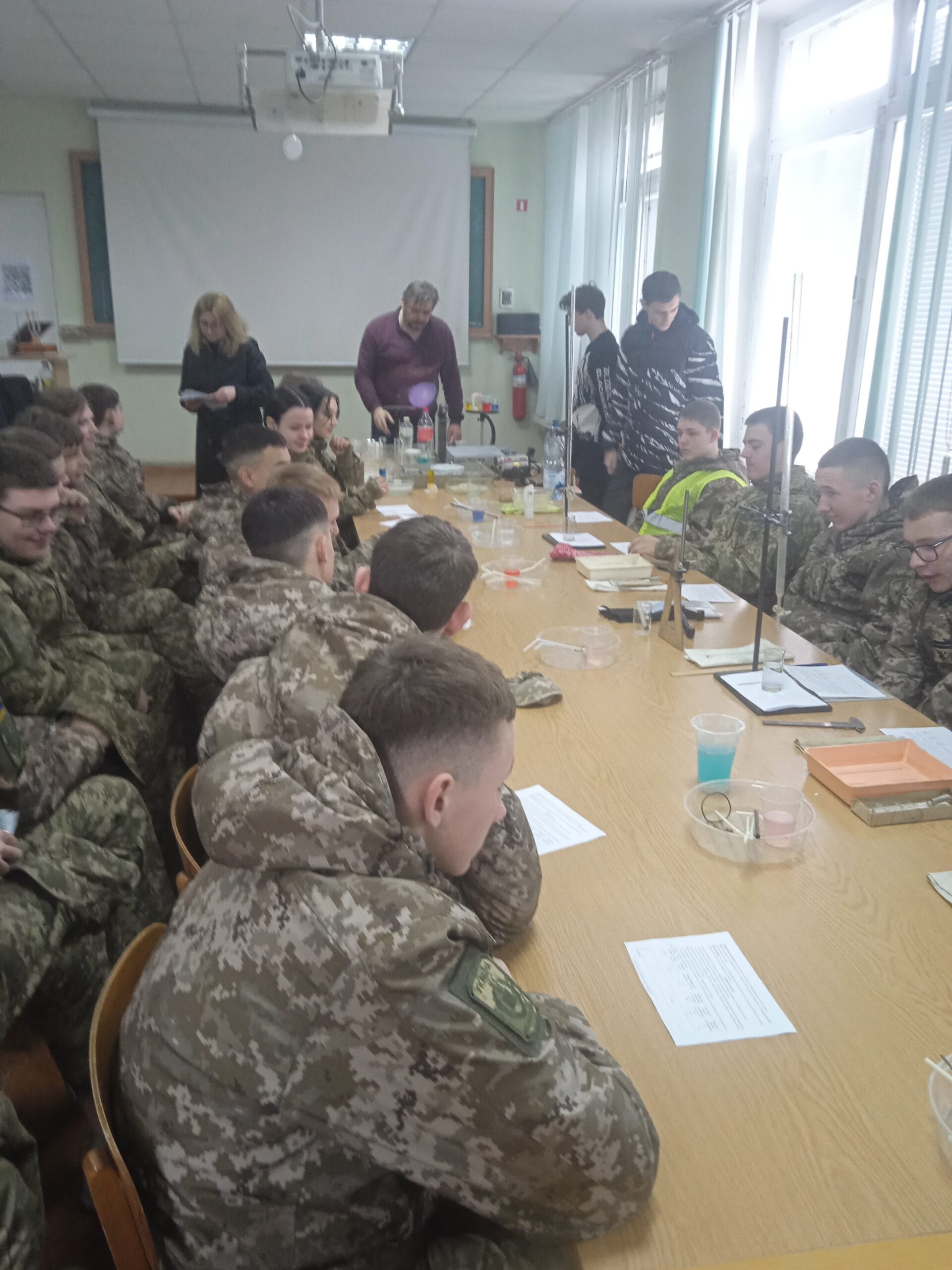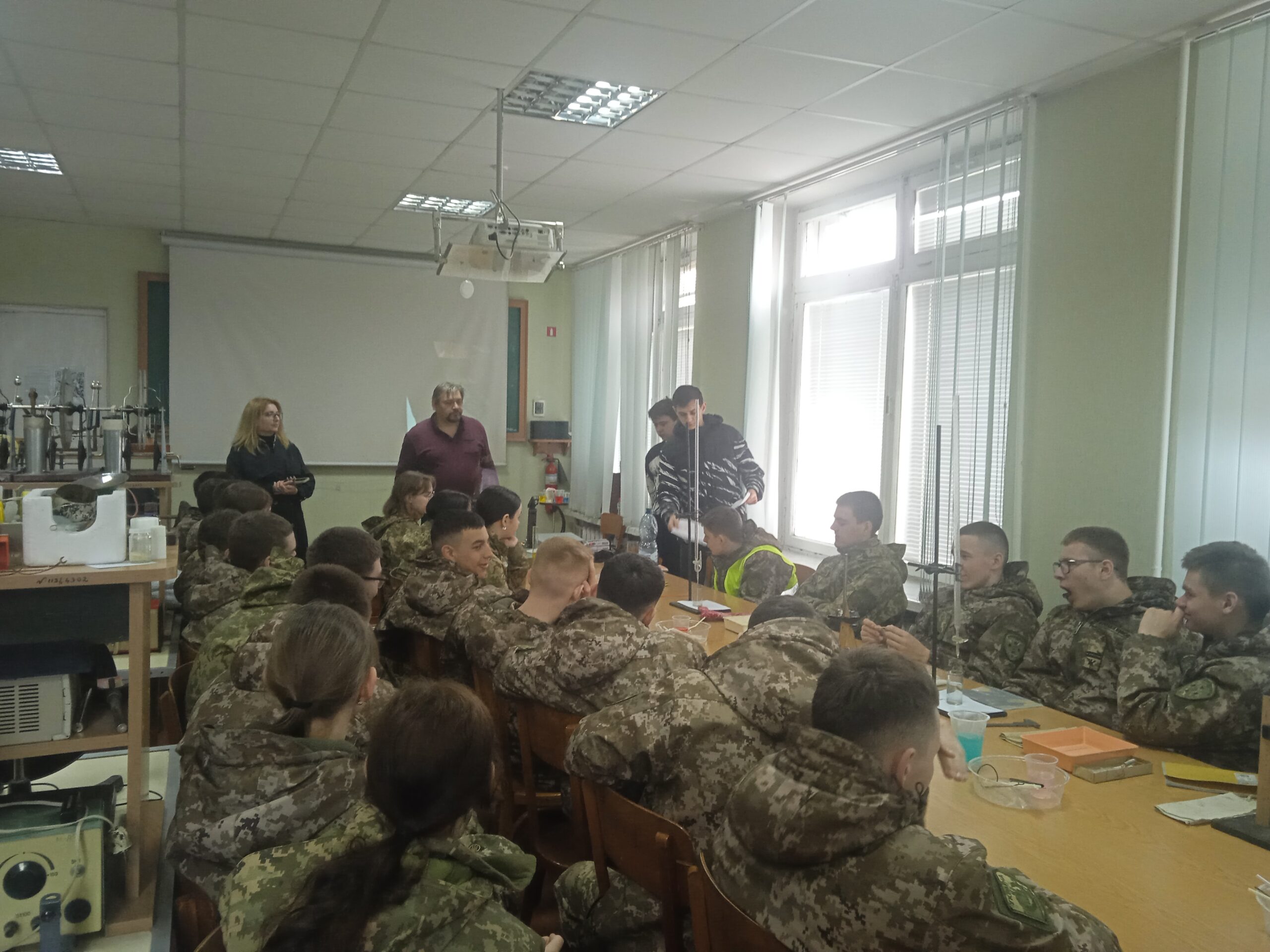 1 квітня в рамках реалізації заходів присвячених Дню відкритих дверей Кам’янець-Подільського національного університету імені Івана Огієнка на фізико-математичному факультеті відбулася зустріч учнів 10-х класів Кам’янець-Подільського військового ліцею зі студентами освітньо-професійної програми “Середня освіта. Фізика, інформатика” магістерського і бакалаврського рівня підготовким. В процесі спілкування учні ознайомилися з умовами вступу, вимогами до навчання, навчальними дисциплінами, що вивчають студенти. Учні відвідали лабораторії фізики та прийняли участь у науково-дослідній експедиції “Дослідження поверхневого натягу рідин”, де провели низку цікавих експериментів. Особливу зацікавленість викликали досліди із формування кольорових повітряних куль великого діаметру, створення різних конфігурацій у мильних плівках та вивчення властивостей “неньютовнівських” рідин. Активну участь у проведенні експериментів прийняли студенти академгрупи F1B22 Андрій ФЕДОРУК та Олександр СТЕЦЮК та студентка академгрупи F1M24 Поліна ІВАНОВИЧ. Цікавість також викликала розповідь професора кафедри фізики Аркадія КУХА про застосування різних вологовідштовхуючих матеріалів в екіпіровці військових.