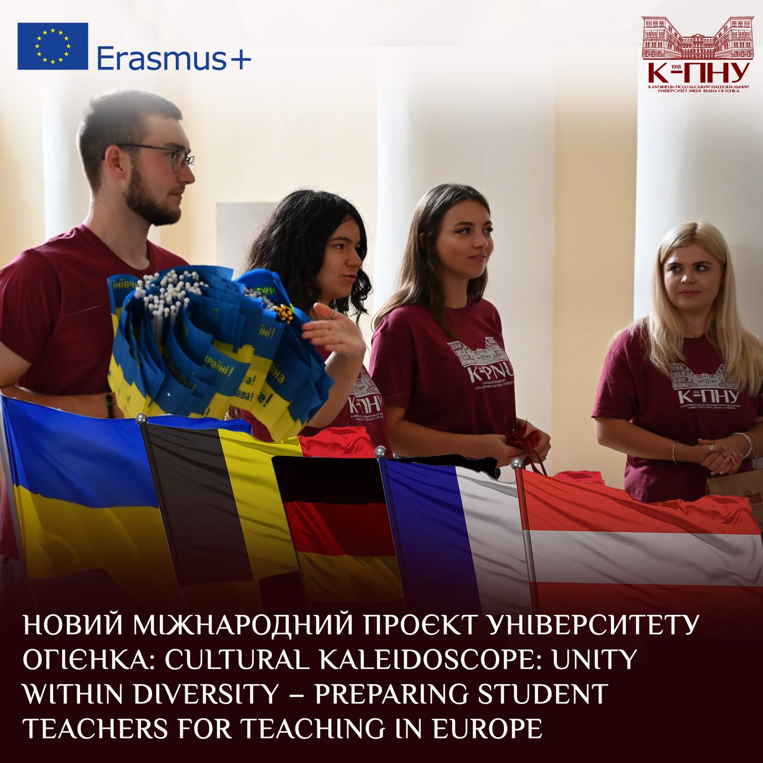 Проєкт „Cultural kaleidoscope: unity within diversity – preparing student teachers for teaching in Europe” буде реалізовано спільно з такими університетами: Університет Хауест (Бельгія) https://www.howest.be/en/campuses/bruges/bruges-station/bst-d, Університет Фрідріха-Александра Ерланген-Нюрнберг https://www.fau.de/ (Німеччина), Університет Пікардії Жюля Верна https://www.u-picardie.fr/ (Франція) та Приватний педагогічний університет Augustinum https://pph-augustinum.at (Австрія).